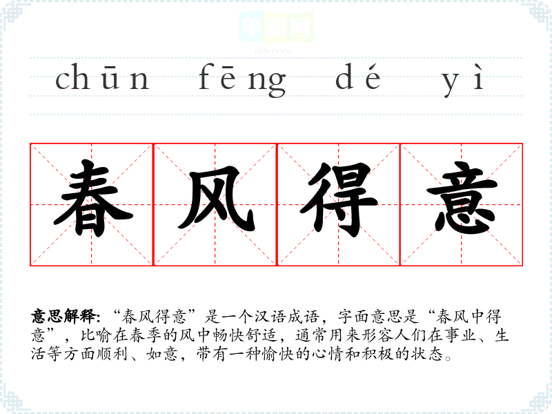 “春风得意”是一个汉语成语,字面意思是“春风中得意”,比喻在春季的风中畅快舒适,通常用来形容人们在事业、生活等方面顺利、如意,带有一种愉快的心情和积极的状态。