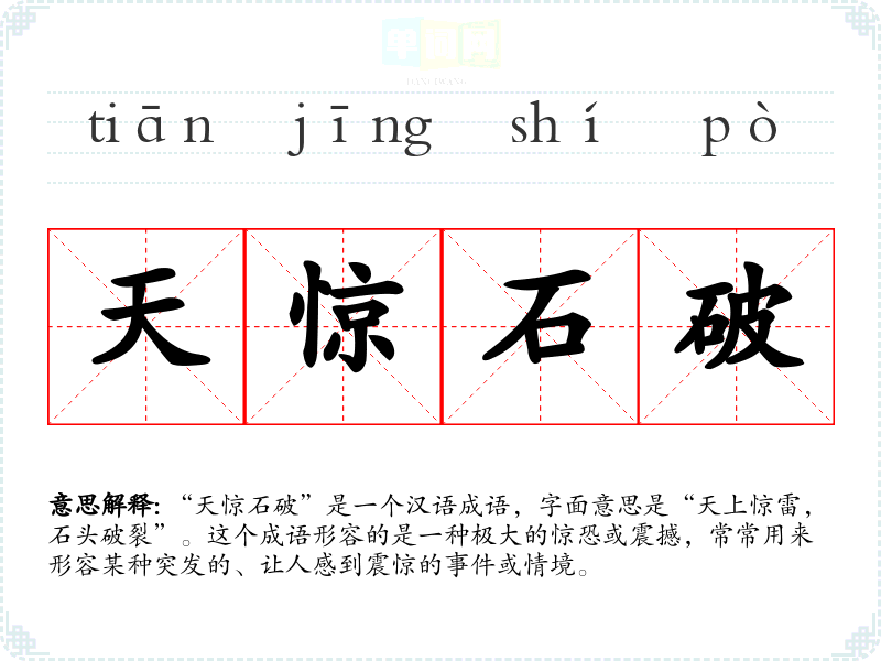 “天惊石破”是一个汉语成语,字面意思是“天上惊雷,石头破裂”。这个成语形容的是一种极大的惊恐或震撼,常常用来形容某种突发的、让人感到震惊的**或情境。