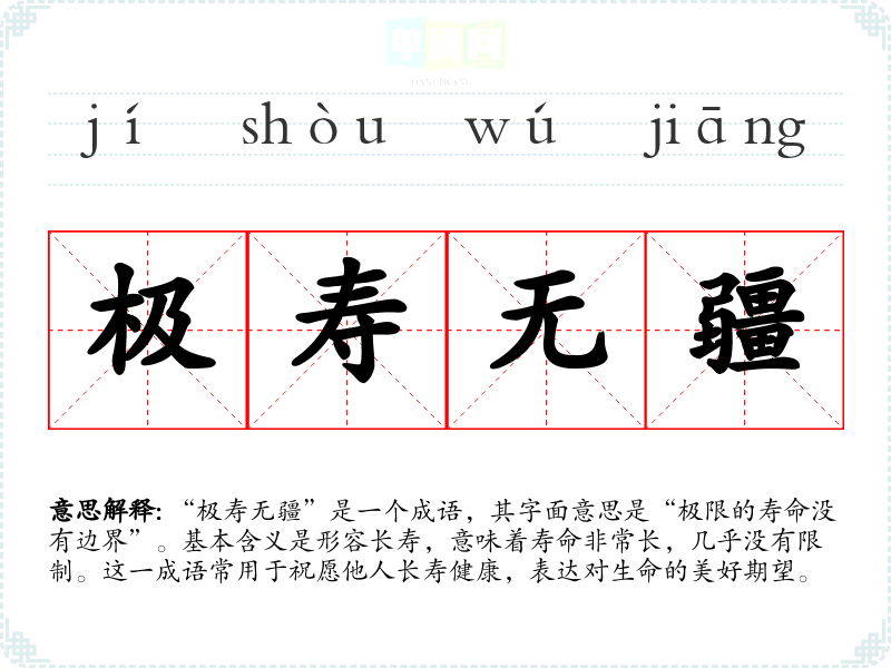 “极寿无疆”常用于祝贺场合,如生日祝福、节日祝福等。在文学作品中,作者可能会使用这个成语来描绘长寿的美好,或表达对老年人的敬重。日常对话中,朋友之间、家人之间也会使用这个成语来祝福彼此的健康长寿。
