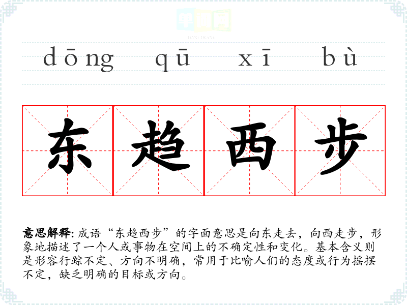 成语“东趋西步”的字面意思是向东走去,向西走步,形象地描述了一个人或事物在空间上的不确定性和变化。基本含义则是形容行踪不定、方向不明确,常用于比喻人们的态度或行为摇摆不定,缺乏明确的目标或方向。