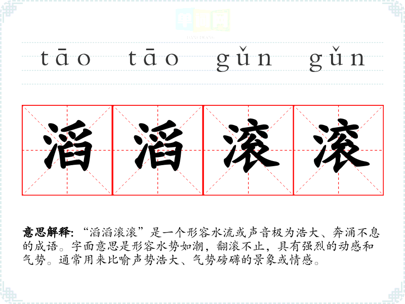 “滔滔滚滚”是一个形容水流或声音极为浩大、奔涌不息的成语。字面意思是形容水势如潮,翻滚不止,具有强烈的动感和气势。通常用来比喻声势浩大、气势磅礴的景象或情感。