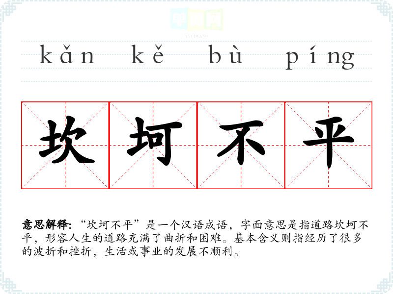 通过对“坎坷不平”的学,我深刻理解了生活中面对困难的重要性。这不仅是对个体心理素质的考验,也是对我们成长与成就的推动力。在语言学和表达中,能够灵活运用这样的成语,不仅丰富了语言表达,也加强了情感的传递。