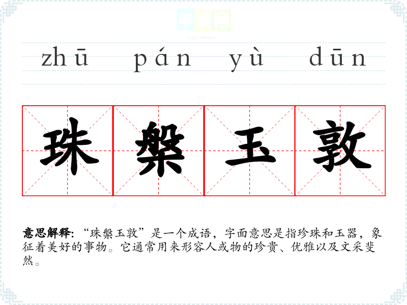 “珠槃玉敦”是一个成语,字面意思是指珍珠和玉器,象征着美好的事物。它通常用来形容人或物的珍贵、优雅以及文采斐然。