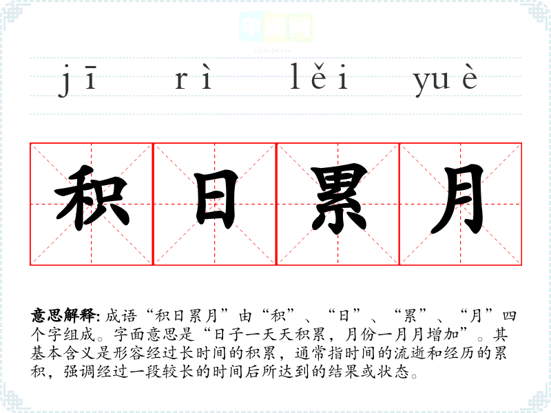 成语“积日累月”由“积”、“日”、“累”、“月”四个字组成。字面意思是“日子一天天积累,月份一月月增加”。其基本含义是形容经过长时间的积累,通常指时间的流逝和经历的累积,强调经过一段较长的时间后所达到的结果或状态。
