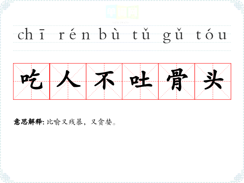 | 吃人不吐骨头 | 比喻又残暴,又贪婪。 |
