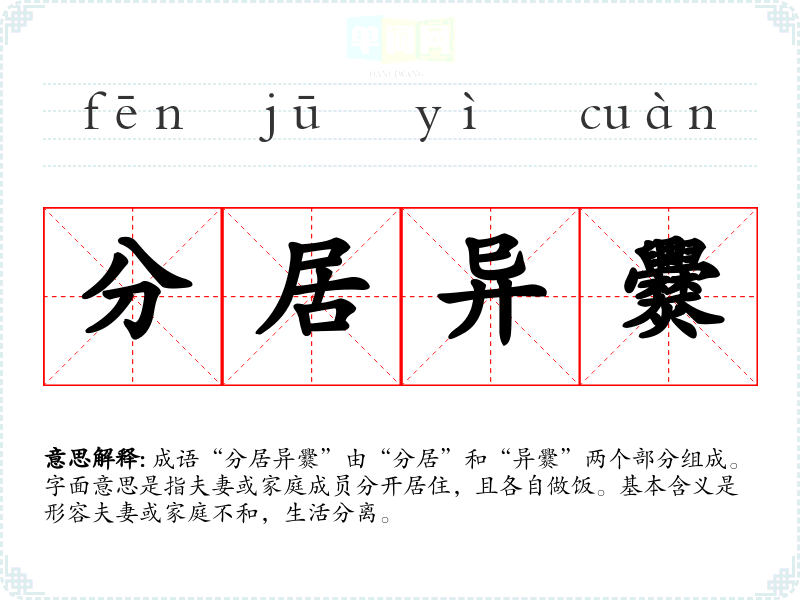 成语“分居异爨”由“分居”和“异爨”两个部分组成。字面意思是指夫妻或家庭成员分开居住,且各自做饭。基本含义是形容夫妻或家庭不和,生活分离。