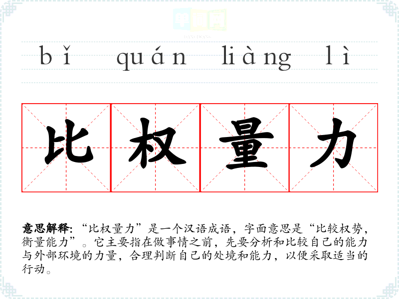 “比权量力”是一个汉语成语,字面意思是“比较权势,衡量能力”。它主要指在做事情之前,先要分析和比较自己的能力与外部环境的力量,合理判断自己的处境和能力,以便采取适当的行动。