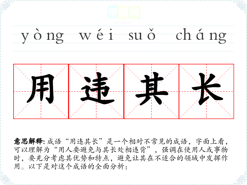 成语“用违其长”是一个相对不常见的成语,字面上看,可以理解为“用人要避免与其长处相违背”,强调在使用人或事物时,要充分考虑其优势和特点,避免让其在不适合的领域中发挥作用。以下是对这个成语的全面分析: