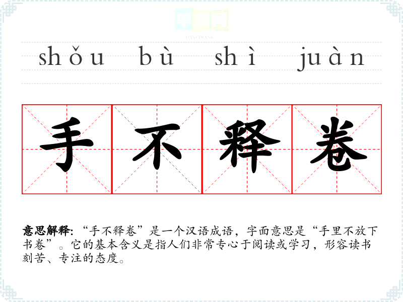 “手不释卷”是一个汉语成语,字面意思是“手里不放下书卷”。它的基本含义是指人们非常专心于阅读或学*,形容读书刻苦、专注的态度。