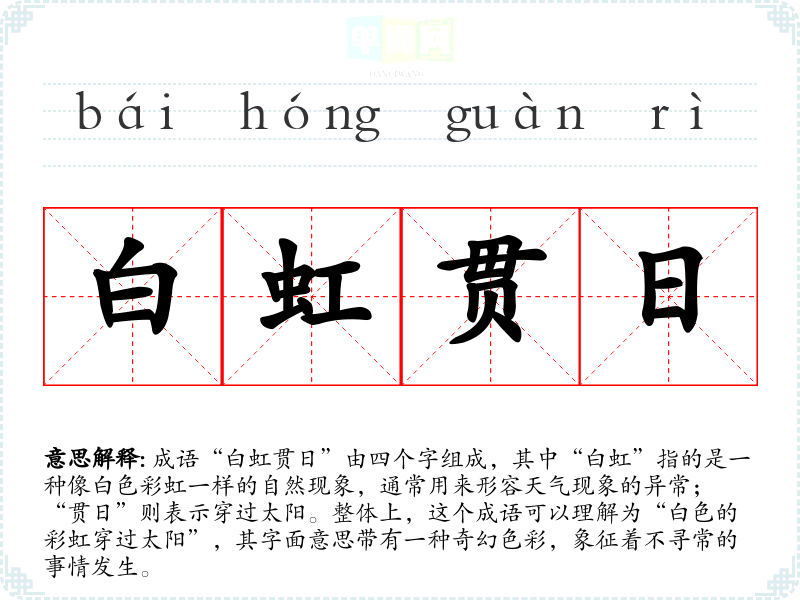 成语“白虹贯日”由四个字组成,其中“白虹”指的是一种像白色彩虹一样的自然现象,通常用来形容天气现象的异常;“贯日”则表示穿过太阳。整体上,这个成语可以理解为“白色的彩虹穿过太阳”,其字面意思带有一种奇幻色彩,象征着不寻常的事情发生。