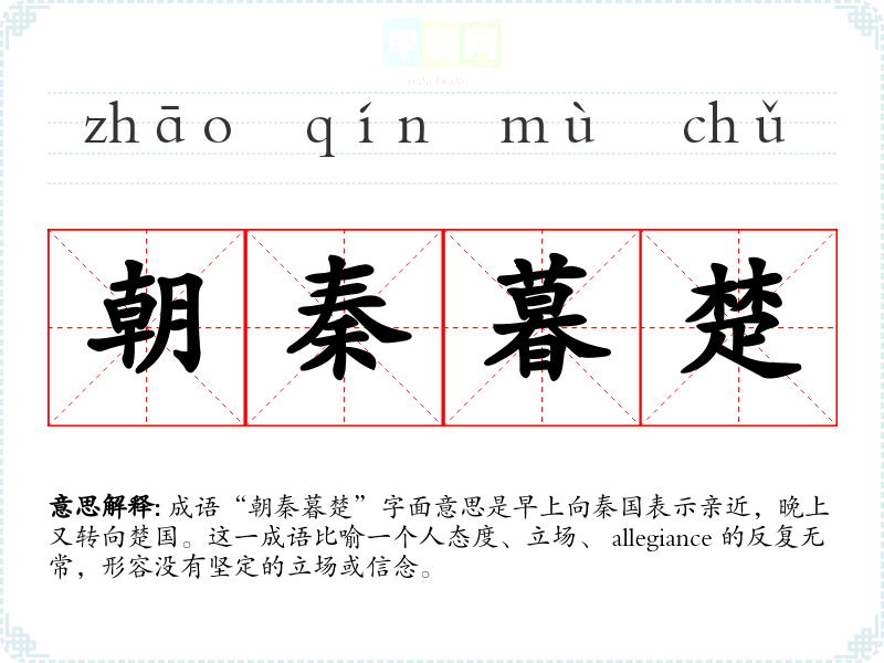 成语“朝秦暮楚”字面意思是早上向秦国表示亲近,晚上又转向楚国。这一成语比喻一个人态度、立场、 allegiance 的反复无常,形容没有坚定的立场或信念。