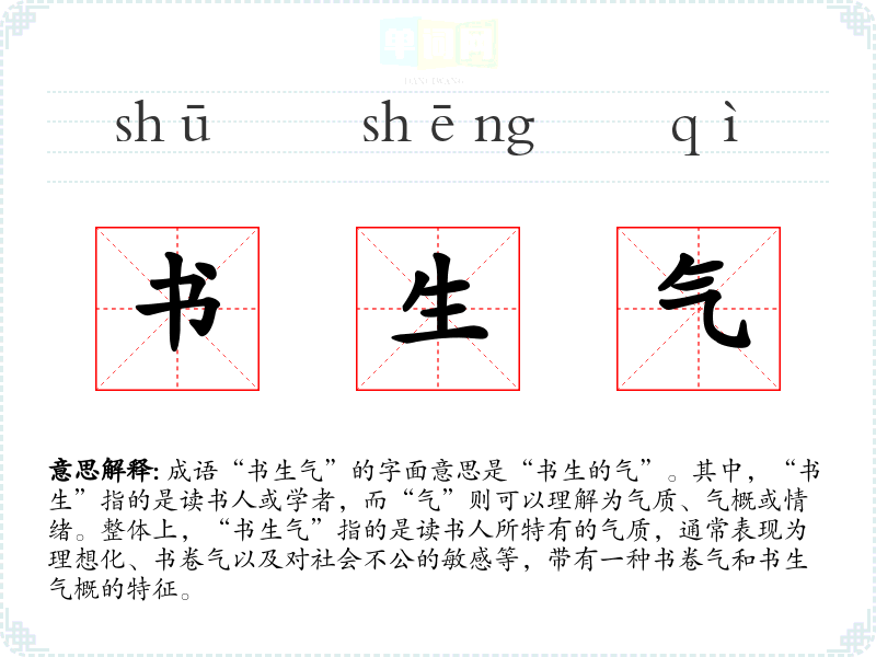成语“书生气”的字面意思是“书生的气”。其中,“书生”指的是读书人或学者,而“气”则可以理解为气质、气概或情绪。整体上,“书生气”指的是读书人所特有的气质,通常表现为理想化、书卷气以及对社会不公的敏感等,带有一种书卷气和书生气概的特征。