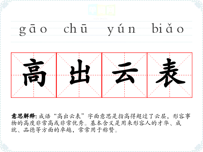 成语“高出云表”字面意思是指高得超过了云层,形容事物的高度非常高或非常优秀。基本含义是用来形容人的才华、成就、品德等方面的卓越,常常用于称赞。