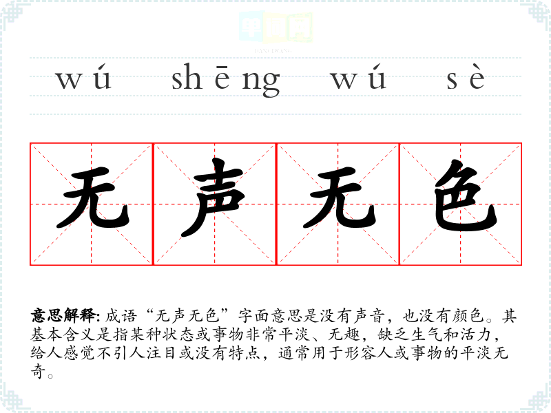 成语“无声无色”字面意思是没有声音,也没有颜色。其基本含义是指某种状态或事物非常平淡、无趣,缺乏生气和活力,给人感觉不引人注目或没有特点,通常用于形容人或事物的平淡无奇。