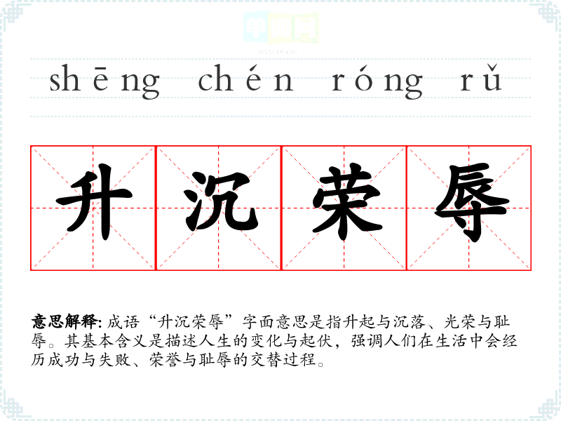 成语“升沉荣辱”字面意思是指升起与沉落、光荣与耻辱。其基本含义是描述人生的变化与起伏,强调人们在生活中会经历成功与失败、荣誉与耻辱的交替过程。
