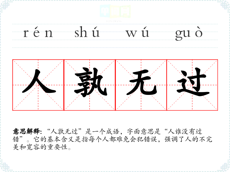 “人孰无过”是一个成语,字面意思是“人谁没有过错”。它的基本含义是指每个人都难免会犯错误,强调了人的不完美和宽容的重要性。
