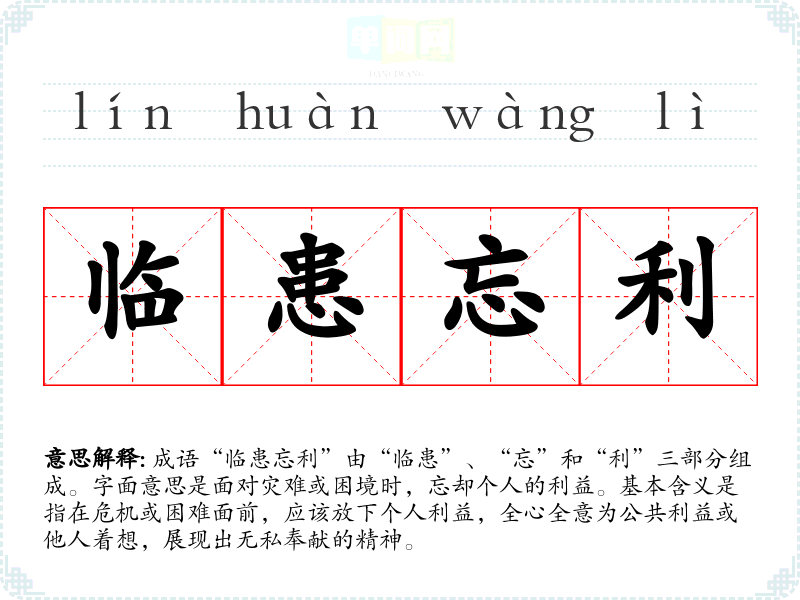 成语“临患忘利”由“临患”、“忘”和“利”三部分组成。字面意思是面对灾难或困境时,忘却个人的利益。基本含义是指在危机或困难面前,应该放下个人利益,全心全意为公共利益或他人着想,展现出无私奉献的精神。