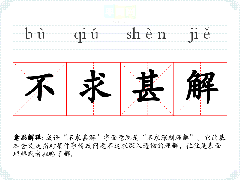 | 不求甚解 | 甚:很,极。只求知道个大概,不求彻底了解。常指学习或研究不认真、不深入。 |