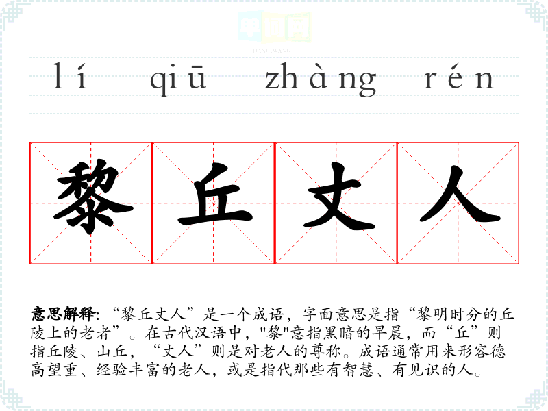 “黎丘丈人”是一个成语,字面意思是指“黎明时分的丘陵上的老者”。在古代汉语中,"黎"意指黑暗的早晨,而“丘”则指丘陵、山丘,“丈人”则是对老人的尊称。成语通常用来形容德高望重、经验丰富的老人,或是指代那些有智慧、有见识的人。