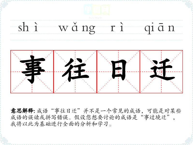 成语“事往日迁”并不是一个常见的成语,可能是对某些成语的误读或拼写错误。假设您想要讨论的成语是“事过境迁”,我将以此为基础进行全面的分析和学*。