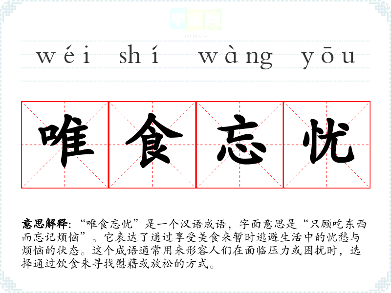 “唯食忘忧”是一个汉语成语,字面意思是“只顾吃东西而忘记烦恼”。它表达了通过享受美食来暂时逃避生活中的忧愁与烦恼的状态。这个成语通常用来形容人们在面临压力或困扰时,选择通过饮食来寻找慰藉或放松的方式。