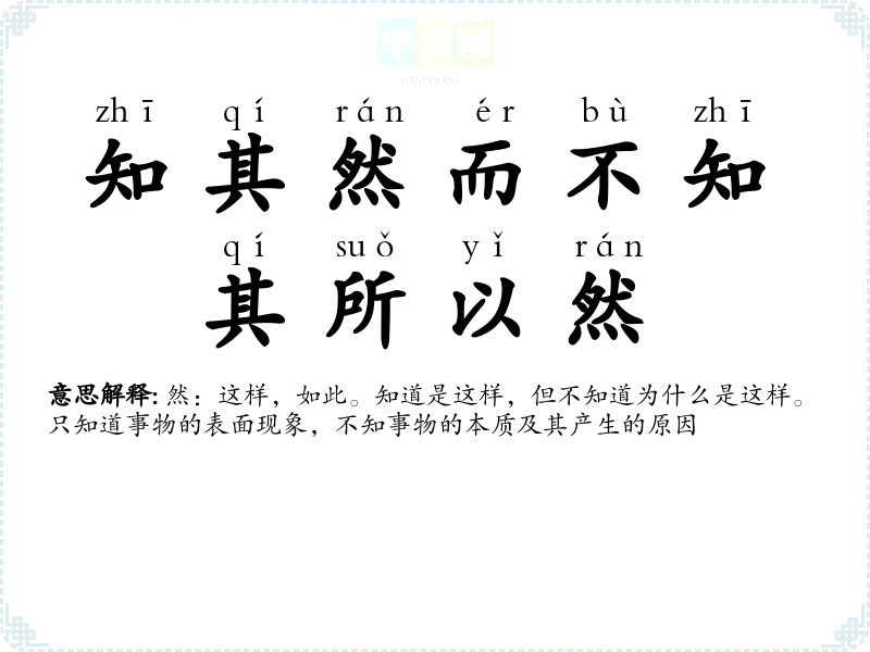 | 不知其所以然 | 不知它究竟如何会这样的。指不了解事物的本质或事情的根底。 |