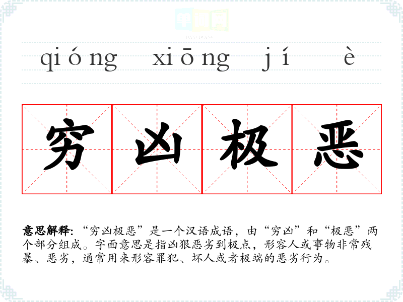 “穷凶极恶”是一个汉语成语,由“穷凶”和“极恶”两个部分组成。字面意思是指凶狠恶劣到极点,形容人或事物非常残暴、恶劣,通常用来形容罪犯、坏人或者极端的恶劣行为。
