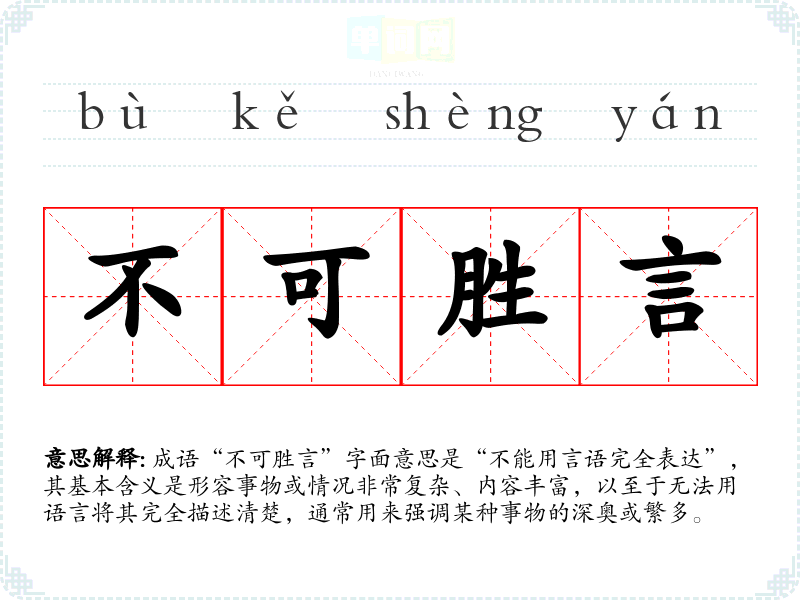 成语“不可胜言”字面意思是“不能用言语完全表达”,其基本含义是形容事物或情况非常复杂、内容丰富,以至于无法用语言将其完全描述清楚,通常用来强调某种事物的深奥或繁多。