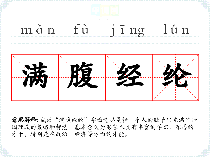 成语“满腹经纶”字面意思是指一个人的肚子里充满了治国理政的策略和智慧。基本含义为形容人具有丰富的学识、深厚的才干,特别是在政治、经济等方面的才能。