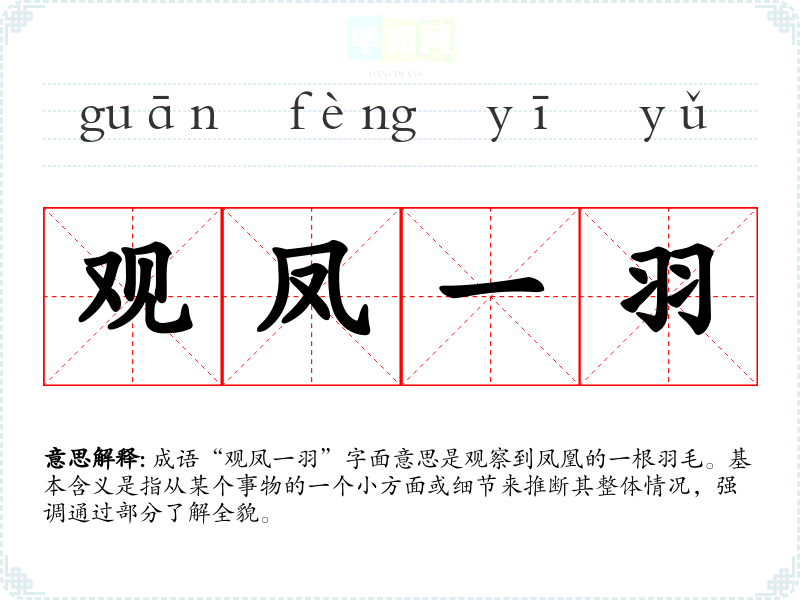 “观凤一羽”出自《荀子·劝学》,原文为“观凤之羽,知凤凰之声;观龙之蛇,知龙之德。”它强调通过观察事物的部分特征,可以理解整体的性质。这一成语反映了古人对事物本质和特征的深刻理解。