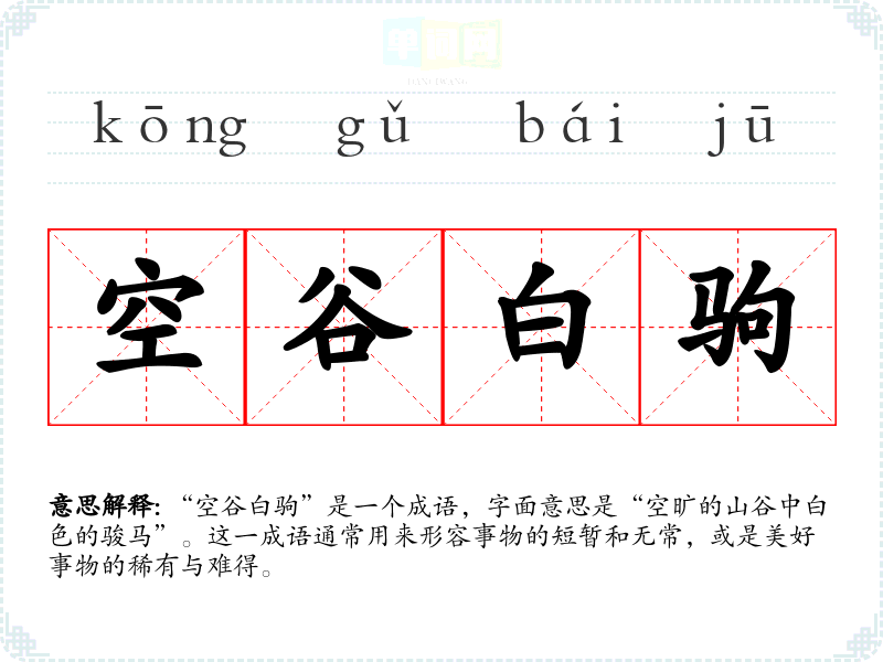 “空谷白驹”是一个成语,字面意思是“空旷的山谷中白色的骏马”。这一成语通常用来形容事物的短暂和无常,或是美好事物的稀有与难得。