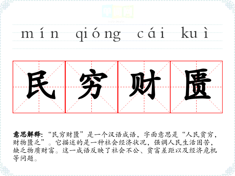 “民穷财匮”是一个汉语成语,字面意思是“人民贫穷,财物匮乏”。它描述的是一种社会经济状况,强调人民生活困苦,缺乏物质财富。这一成语反映了社会不公、贫富差距以及经济危机等问题。