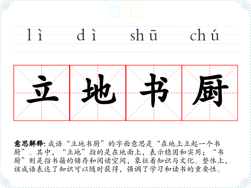 成语“立地书厨”的字面意思是“在地上立起一个书厨”。其中,“立地”指的是在地面上,表示稳固和实用;“书厨”则是指书籍的储存和阅读空间,象征着知识与文化。整体上,该成语表达了知识可以随时获得,强调了学*和读书的重要性。