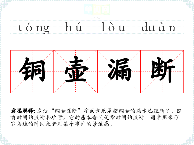 成语“铜壶漏断”字面意思是指铜壶的漏水已经断了,隐喻时间的流逝和珍贵。它的基本含义是指时间的流逝,通常用来形容急迫的时间或者对某个**的紧迫感。