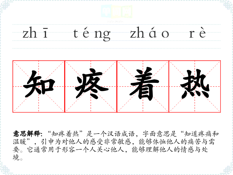 “知疼着热”是一个汉语成语,字面意思是“知道疼痛和温暖”,引申为对他人的感受非常敏感,能够体恤他人的痛苦与需要。它通常用于形容一个人关心他人,能够理解他人的情感与处境。