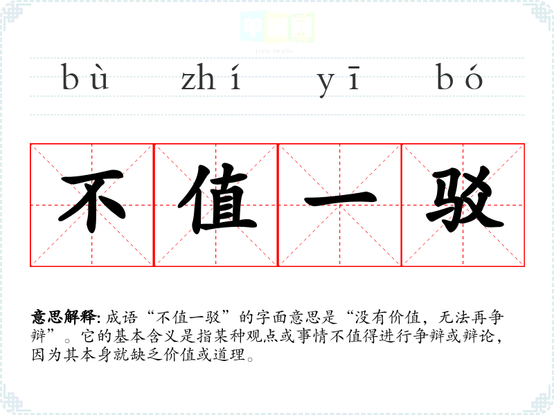 成语“不值一驳”的字面意思是“没有价值,无法再争辩”。它的基本含义是指某种观点或事情不值得进行争辩或辩论,因为其本身就缺乏价值或道理。