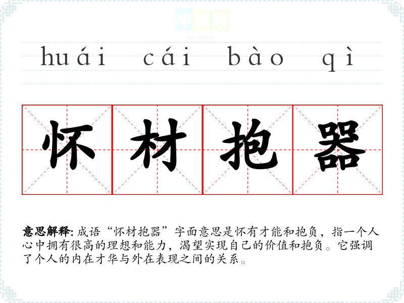 成语“怀材抱器”字面意思是怀有才能和抱负,指一个人心中拥有很高的理想和能力,渴望实现自己的价值和抱负。它强调了个人的内在才华与外在表现之间的关系。