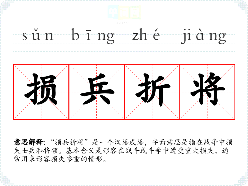“损兵折将”是一个汉语成语,字面意思是指在战争中损失士兵和将领。基本含义是形容在战斗或斗争中遭受重大损失,通常用来形容损失惨重的情形。