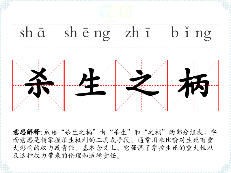 成语“杀生之柄”由“杀生”和“之柄”两部分组成。字面意思是指掌握杀生权利的工具或手段,通常用来比喻对生死有重大影响的权力或责任。基本含义上,它强调了掌控生死的重大性以及这种权力带来的伦理和道德责任。