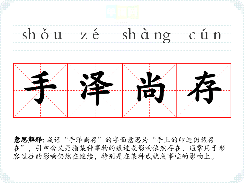 成语“手泽尚存”的字面意思为“手上的印迹仍然存在”,引申含义是指某种事物的痕迹或影响依然存在,通常用于形容过往的影响仍然在继续,特别是在某种成就或事迹的影响上。