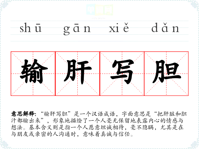 “输肝写胆”是一个汉语成语,字面意思是“把肝脏和胆汁都输出来”,形象地描绘了一个人毫无保留地表露内心的情感与想法。基本含义则是指一个人愿意坦诚相待,毫不隐瞒,尤其是在与朋友或亲密的人沟通时,意味着真诚与信任。