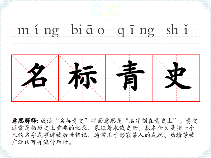 | 名不常存 | 标:写明;青史:古代在竹简上记事,因称史书。把姓名事迹记载在历史书籍上。形容功业巨大,永垂不朽。 |