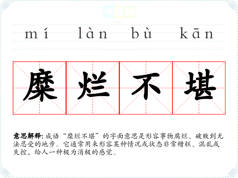 “糜烂”一词本身就与腐烂、损坏相关,常用于形容物体或状态的破坏。而“不堪”则表示无法承受、无法忍受。该成语并没有明确的历史典故,但在文学作品中,常用于描绘社会风气的败坏、道德的腐化等现象。