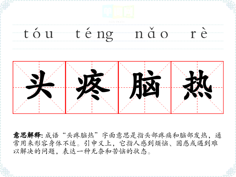 成语“头疼脑热”字面意思是指头部疼痛和脑部发热,通常用来形容身体不适。引申义上,它指人感到烦恼、困惑或遇到难以解决的问题,表达一种无奈和苦恼的状态。