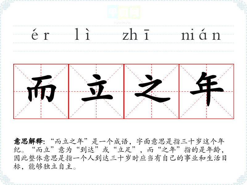 “而立之年”是一个成语,字面意思是指三十岁这个年纪。“而立”意为“到达”或“立足”,而“之年”指的是年龄,因此整体意思是指一个人到达三十岁时应当有自己的事业和生活目标,能够独立自主。