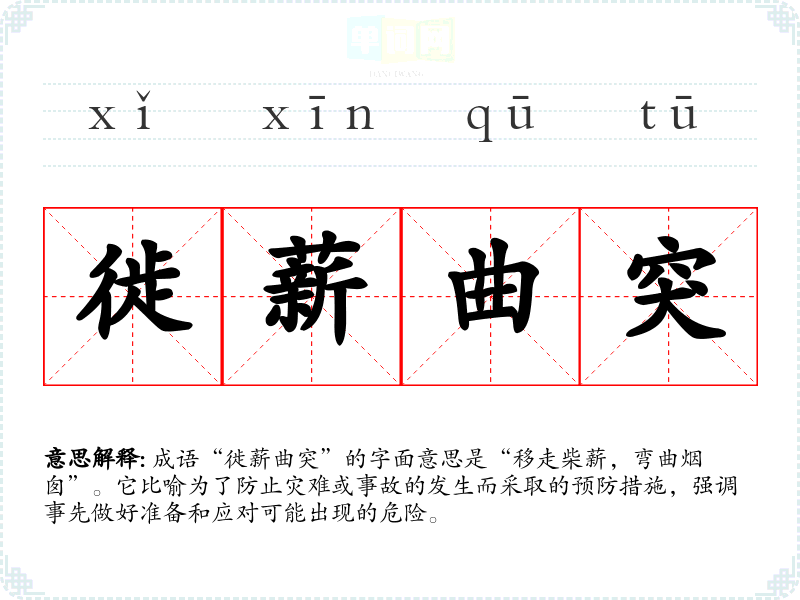 成语“徙薪曲突”的字面意思是“移走柴薪,弯曲烟囱”。它比喻为了防止灾难或事故的发生而采取的预防措施,强调事先做好准备和应对可能出现的危险。
