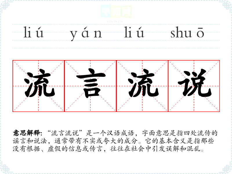 “流言流说”是一个汉语成语,字面意思是指四处流传的谣言和说法,通常带有不实或夸大的成分。它的基本含义是指那些没有根据、虚假的信息或传言,往往在社会中引发误解和混乱。