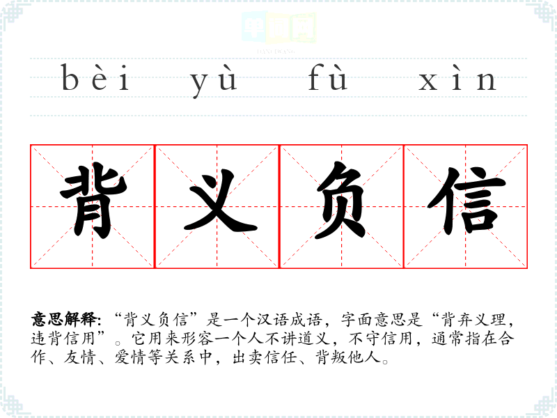 “背义负信”是一个汉语成语,字面意思是“背弃义理,违背信用”。它用来形容一个人不讲道义,不守信用,通常指在合作、友情、爱情等关系中,出卖信任、背叛他人。