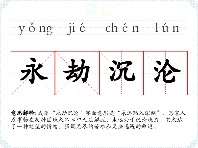 成语“永劫沉沦”字面意思是“永远陷入深渊”,形容人或事物在某种困境或不幸中无法解脱,永远处于沉沦状态。它表达了一种绝望的情绪,强调无尽的苦难和无法逃避的命运。
