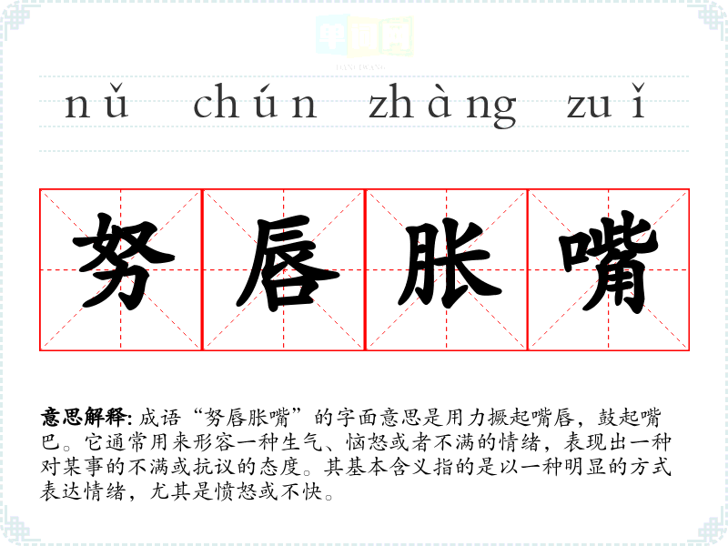 成语“努唇胀嘴”的字面意思是用力撅起嘴唇,鼓起嘴巴。它通常用来形容一种生气、恼怒或者不满的情绪,表现出一种对某事的不满或抗议的态度。其基本含义指的是以一种明显的方式表达情绪,尤其是愤怒或不快。